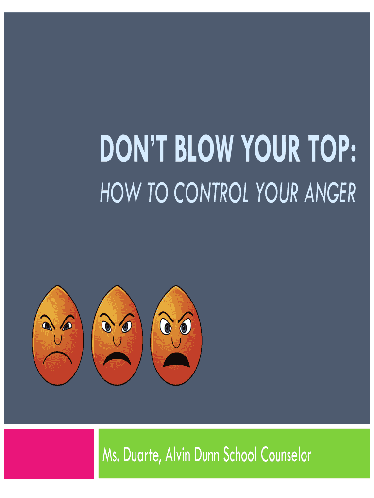 DON'T BLOW YOUR TOP: HOW TO CONTROL YOUR Angers. Duarte, Alvin Dunn School Counselor Alvin Dunn Behavior Expectations Be Ready Be Respectful Be Responsible What will I SEE and HEAR you doing when