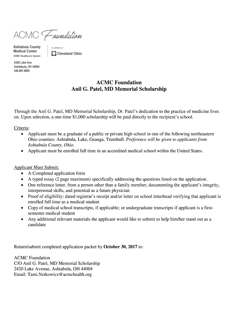 2420 Lake Ave Shaula, OH 44004 440.997.6605ACMC Foundation Anil G. Patel, MD Memorial ScholarshipThrough the Anil G. Patel, MD Memorial Scholarship, Dr. Panels dedication to the practice of medicine