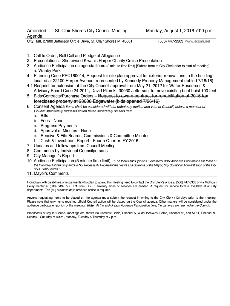 Amended Agendas. Clair Shores City Council Pertinacity Hall, 27600 Jefferson Circle Drive, St. Clair Shores MI 48081Monday, August 1, 2016 7:00 p.m. (586) 4473303 www.scsmi.net1. Call to Order, Roll