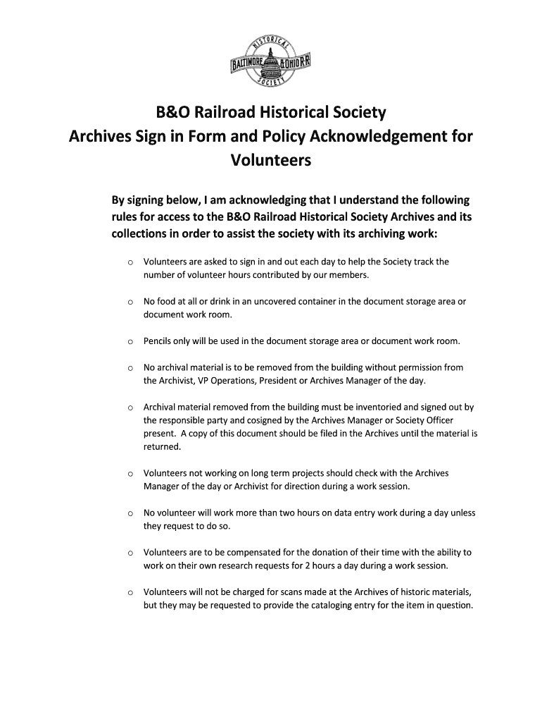 B&O Railroad Historical Society Archives Sign in Form and Policy Acknowledgement for Volunteers By signing below, I am acknowledging that I understand the following rules for access to the B&O Railroad