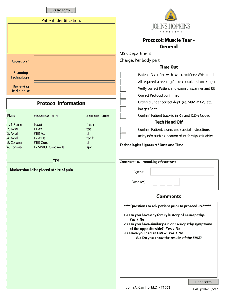 The Muscle Tear Protocol Form should be completed and submitted prior to the imaging procedure to ensure proper examination and patient safety.