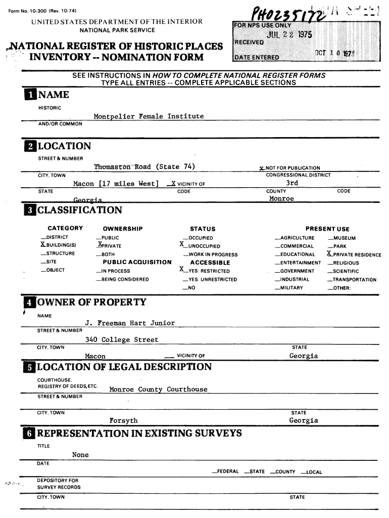 Form No. 10300 (Rev. 1074)UNITED STATES DEPARTMENT OF THE INTERIOR NATIONAL PARK SERVICEJMATIONAL REGISTER OF HISTORIC PLACES INVENTORYNOMINATION FORMiiiiiiiiiiilSEE INSTRUCTIONS IN HOW TO COMPLETE