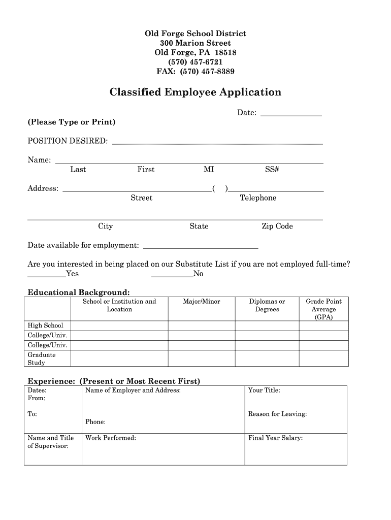 Old Forge School District 300 Marion Street Old Forge, PA 18518 (570) 4576721 FAX: (570) 4578389Classified Employee Application Date: (Please Type or Print)POSITION DESIRED: Name: Last First MI SS#