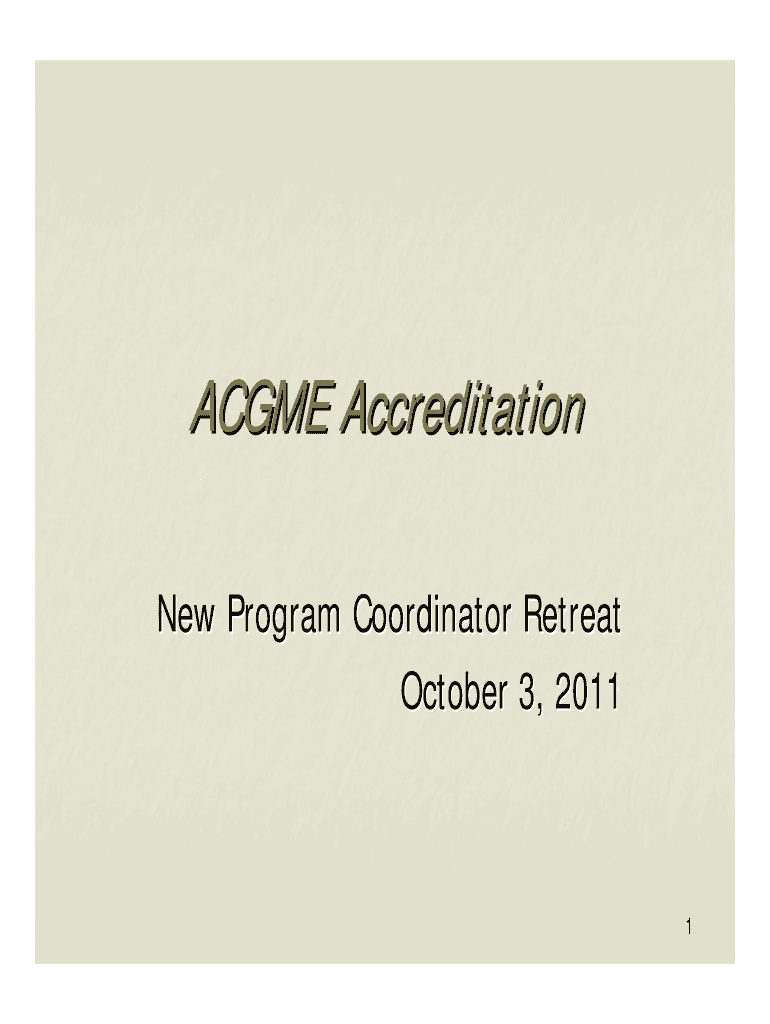 ACME Accreditation New Program Coordinator Retreat October 3, 20111Goals Accreditation cycle: overview Office files: managing paperwork Annual accreditation to-dos ACME rules and program specifics