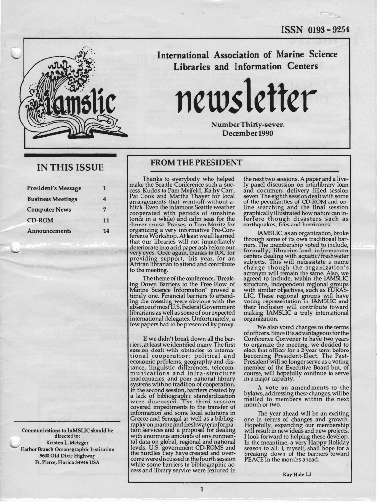 ISSN 0193 9254International Association of Marine ScienceLibraries and Information CentersnewsletterNumber ThirtysevenDecember 1990IN THIS ISSUEPresident's Message1Business Meetings4Computer News7CDROM11Announcements14Communications