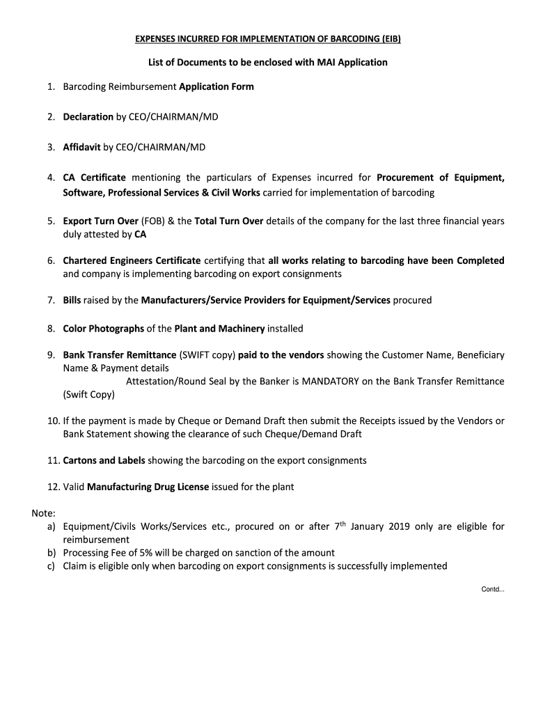 EXPENSES INCURRED FOR IMPLEMENTATION OF BARCODING (EIB)List of Documents to be enclosed with MAI Application 1. Barcoding Reimbursement Application Form 2. Declaration by CEO/CHAIRMAN/MD 3. Affidavit