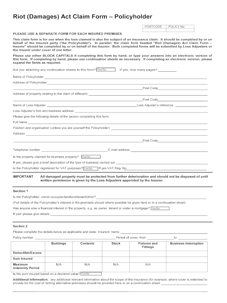 The Riot Damages Act Claim Form is a legal document used by policyholders to claim damages resulting from riots.