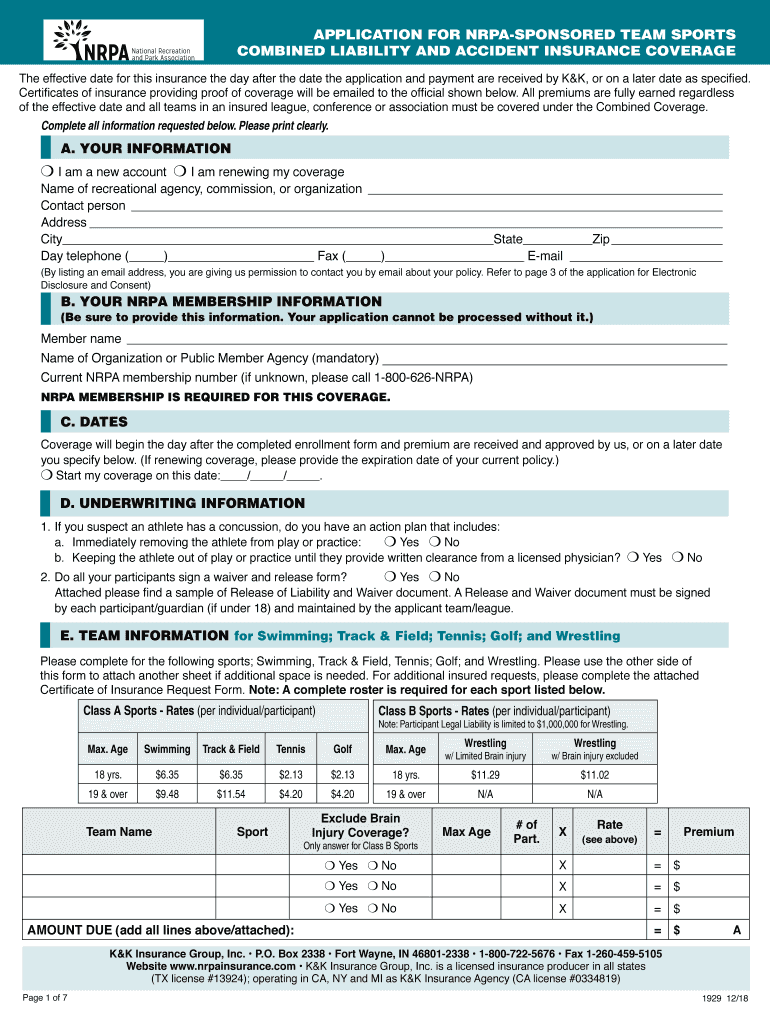 APPLICATION FOR NRPASPONSORED TEAM SPORTS COMBINED LIABILITY AND ACCIDENT INSURANCE COVERAGE The effective date for this insurance the day after the date the application and payment are received by