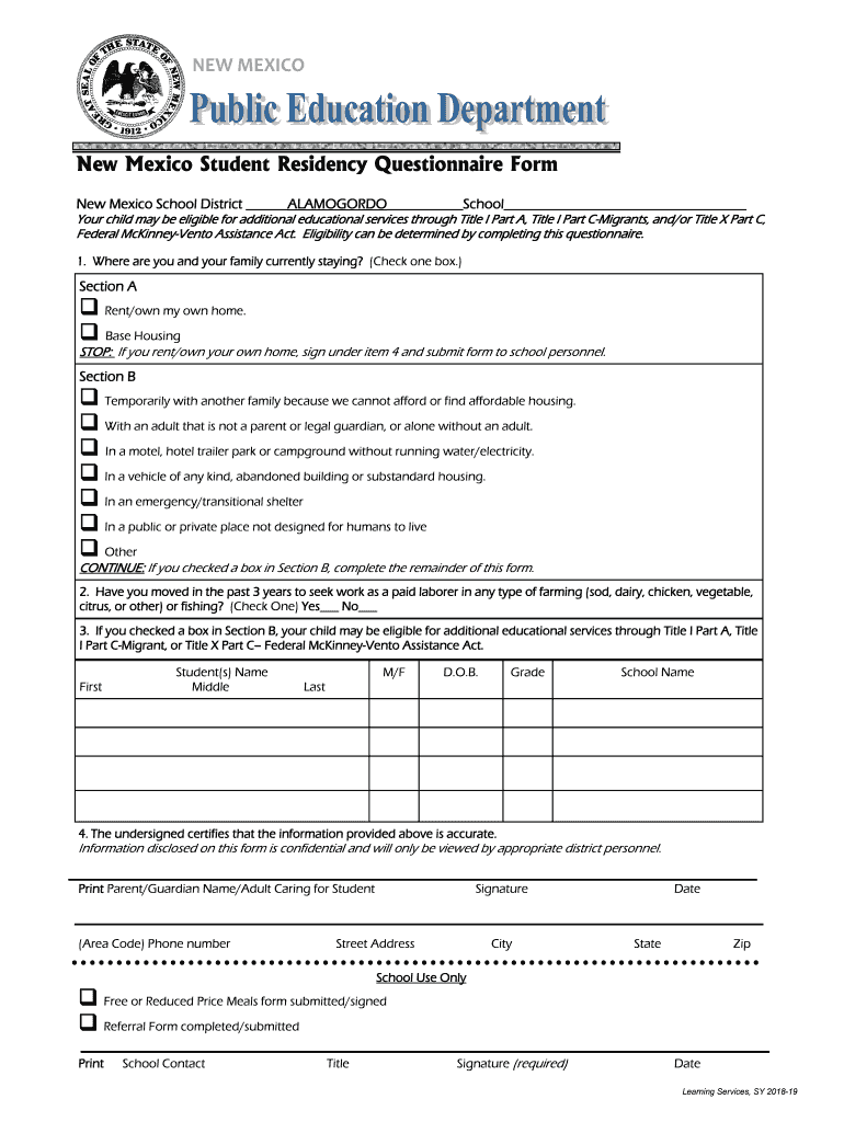 NEWMEXICONew Mexico Student Residency Questionnaire Form New Mexico School District ALAMOGORDO School Your child may be eligible for additional educational services through Title I Part A, Title I