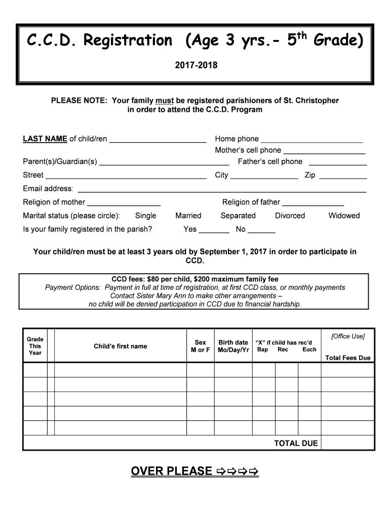 C.C.D. Registration (Age 3 yrs. 5th Grade) 20172018PLEASE NOTE: Your family must be registered parishioners of St. Christopher in order to attend the C.C.D. Programs NAME of child/men Parent(s)/Guardian(s)Home