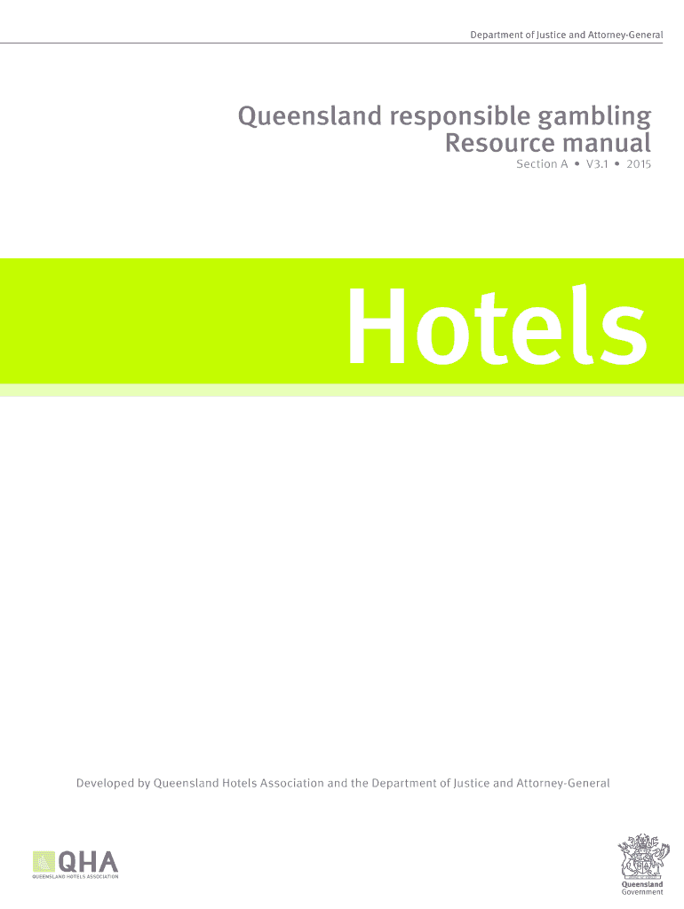 Department of Justice and AttorneyGeneralQueensland responsible gambling Resource manualSection A V3.1 2015HotelsDeveloped by Queensland Hotels Association and the Department of Justice and AttorneyGeneralContents
