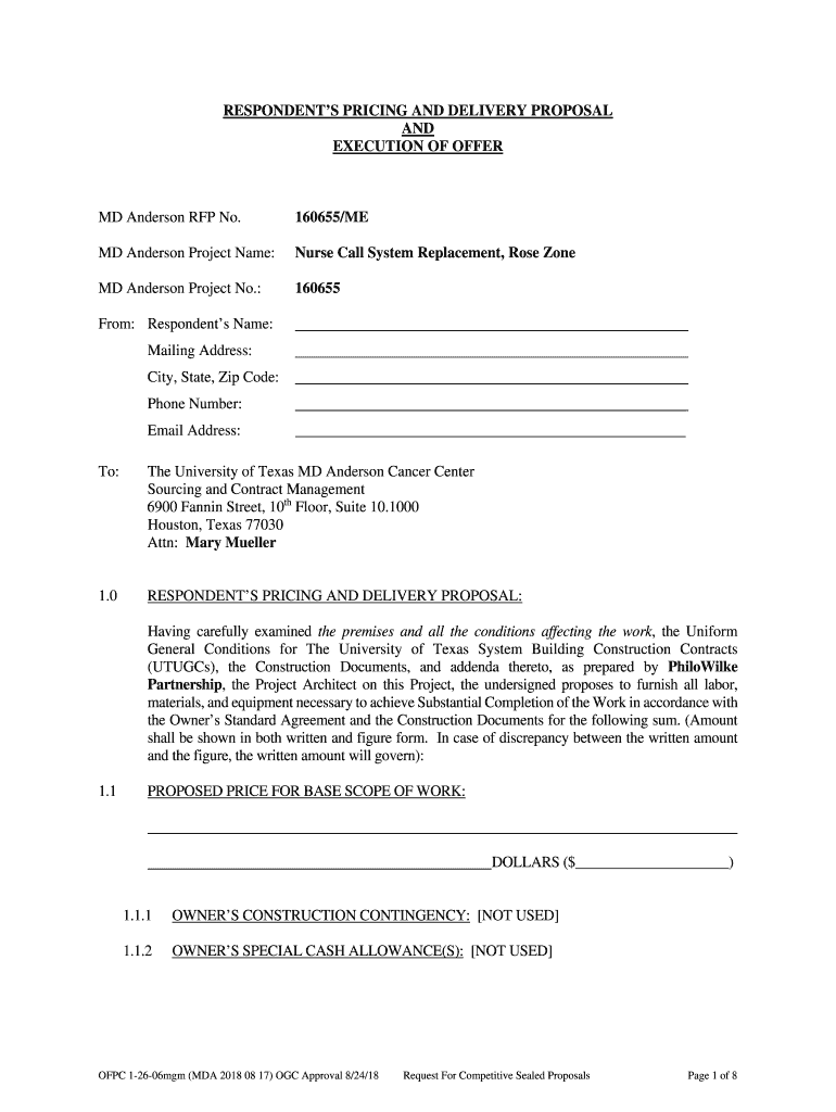 RESPONDENTS PRICING AND DELIVERY PROPOSAL AND EXECUTION OF OFFERED Anderson RFP No.160655/MEMD Anderson Project Name:Nurse Call System Replacement, Rose Zoned Anderson Project No.:160655From: Respondents