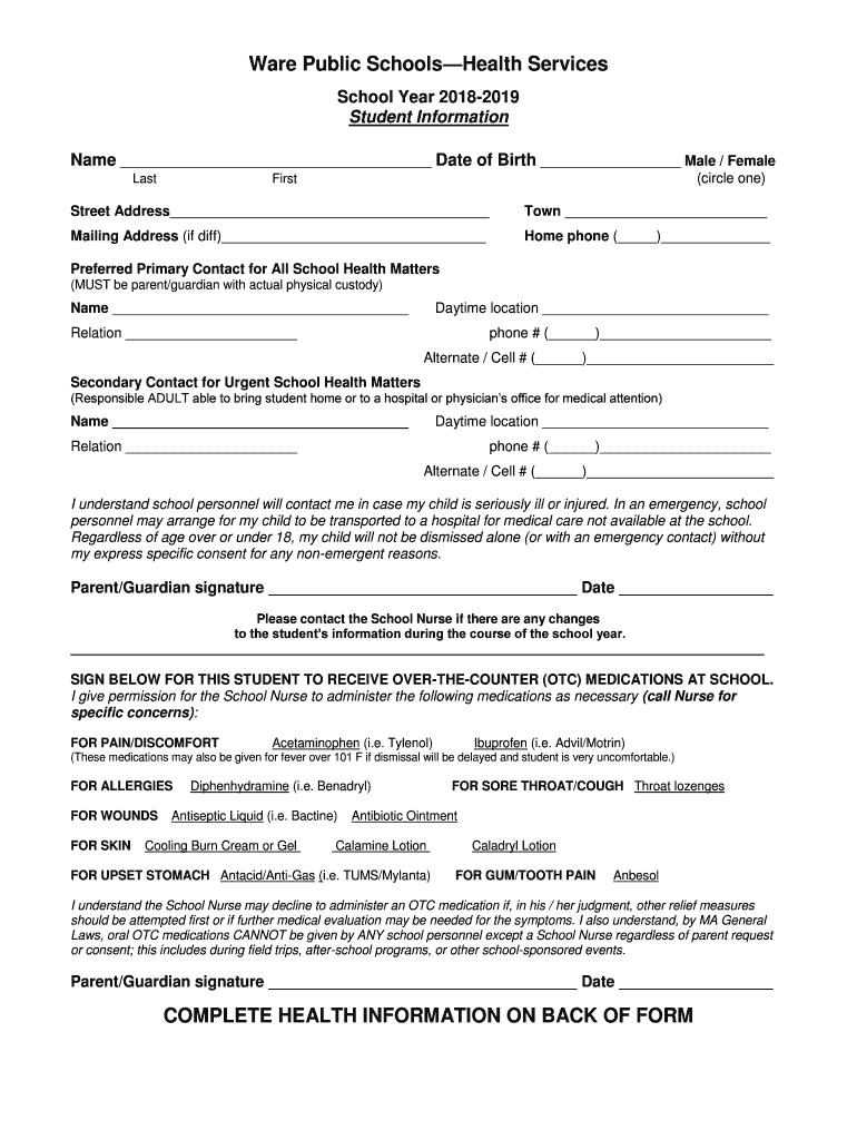 Ware Public SchoolsHealth Services School Year 20182019 Student Information Name Date of Birth Male / Female Last(circle one)FirstStreet Address Town Mailing Address (if diff) Home phone () Preferred