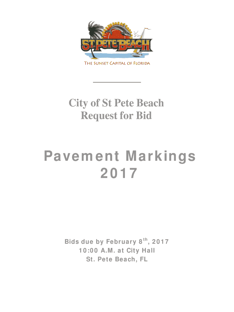 City of St Pete Beach Request for Bid Pavement Markings 2017 Bids due by February 8th, 2017 10:00 A.M. at City Hall St. Pete Beach, FL CONTENTS I.CONTRACTORS BID SUBMITTAL.GENERAL CONTRACT DOCUMENTS.REFERENCES