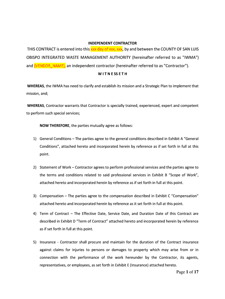 INDEPENDENT CONTRACTORS CONTRACT is entered into this xxx day of xxx, xxx, by and between the COUNTY OF SAN LUIS OBISPO INTEGRATED WASTE MANAGEMENT AUTHORITY (hereinafter referred to as “IMA “)