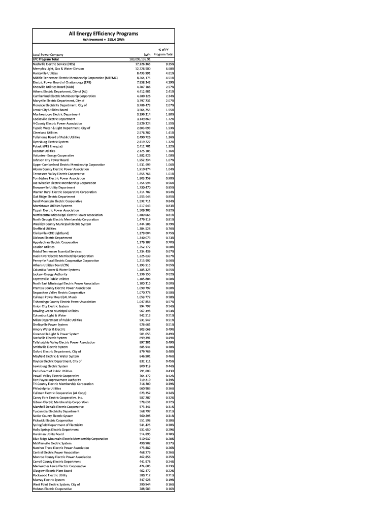 AllEnergyEfficiencyPrograms Achievement255.4GWhLocalPowerCompany LPCProgramTotal NashvilleElectricService(NEW) MemphisLight, Gas&WaterDivision HuntsvilleUtilities MiddleTennesseeElectricMembershipCorporation(MT