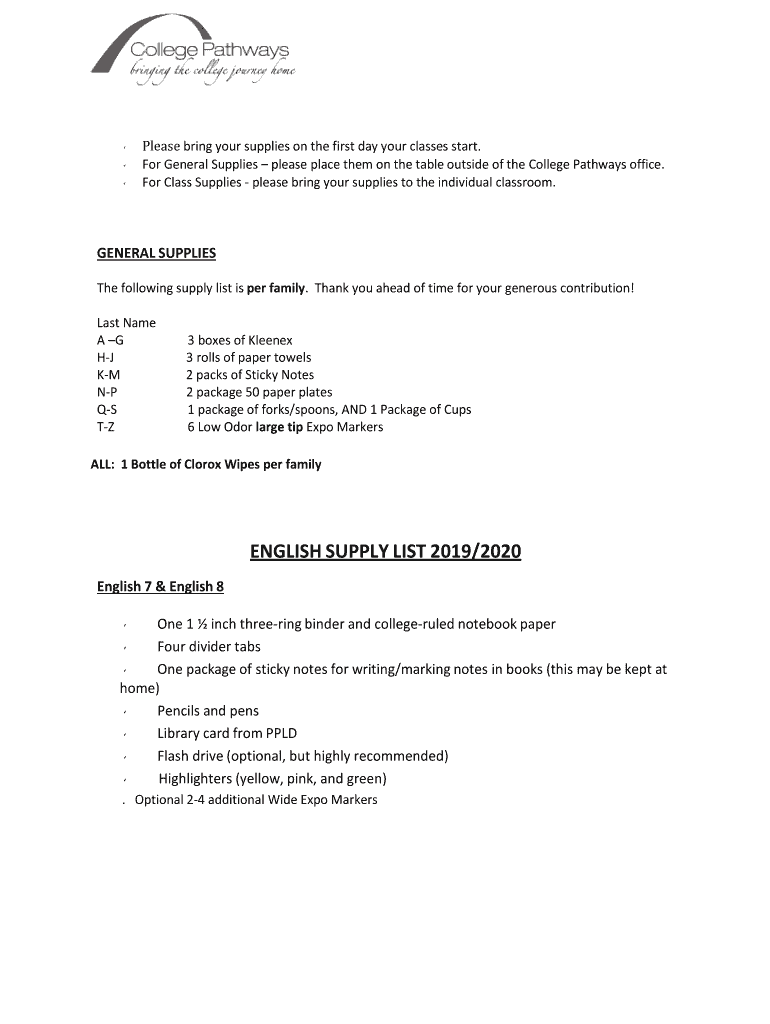 Please bring your supplies on the first day your classes start. For General Supplies please place them on the table outside the College Pathways office. For Class Supplies please bring your supplies