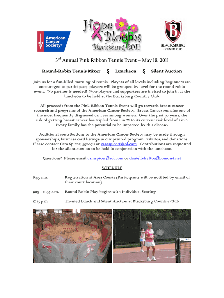 3rd Annual Pink Ribbon Tennis Event May 18, 2011, Round Robin Tennis MixerLuncheonSilent Auctioning us for a fulfilled morning of tennis. Players of all levels including beginners are encouraged to