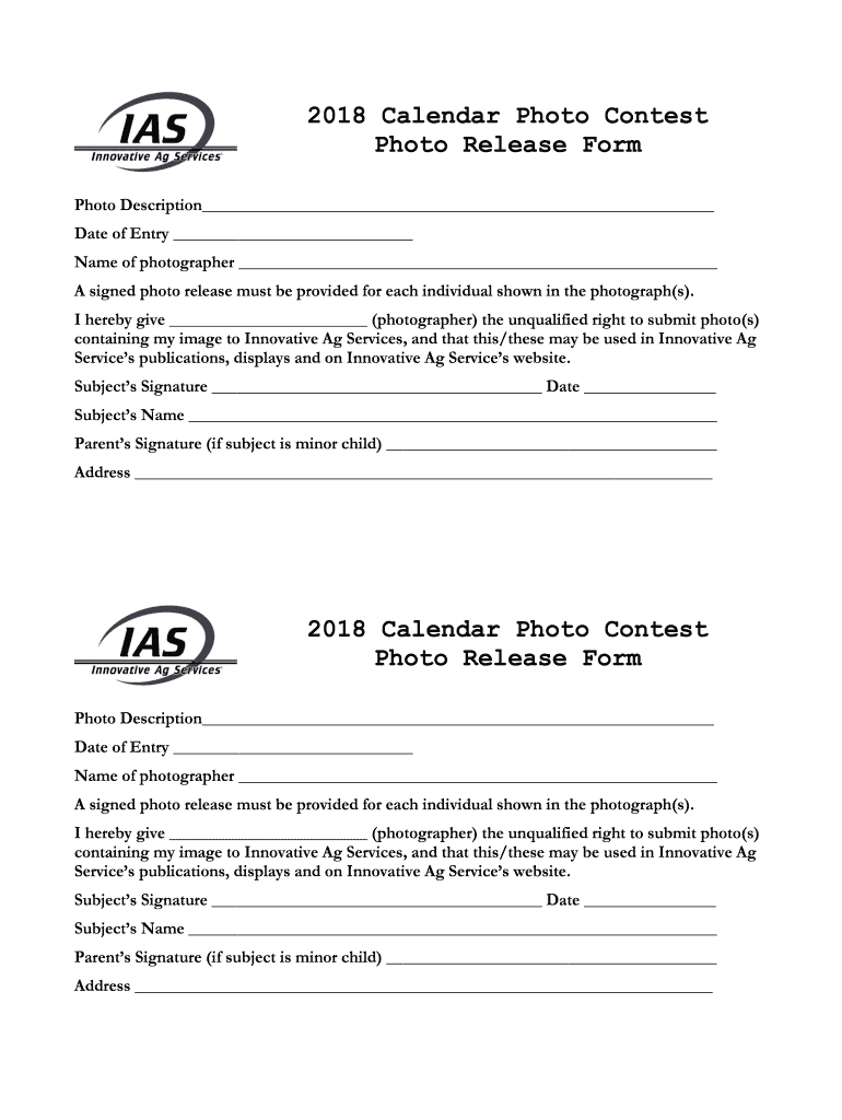 2018 Calendar Photo Contest Photo Release Form Photo Description Date of Entry Name of photographer A signed photo release must be provided for each individual shown in the photograph(s). I hereby