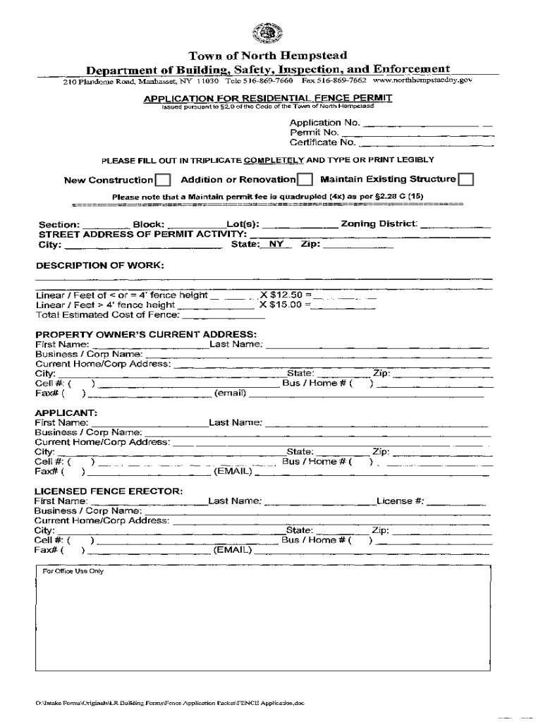 NY Application for Residential Fence Permit 2012-2026 free printable template