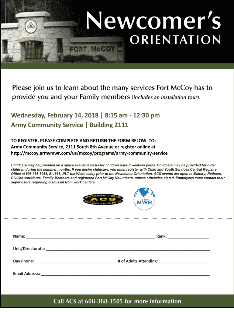 Wednesday, February 14, 2018 8:15 am 12:30 pm Army Community Service Building 2111 TO REGISTER, PLEASE COMPLETE AND RETURN THE FORM BELOW TO: Army Community Service, 2111 South 8th Avenue or register
