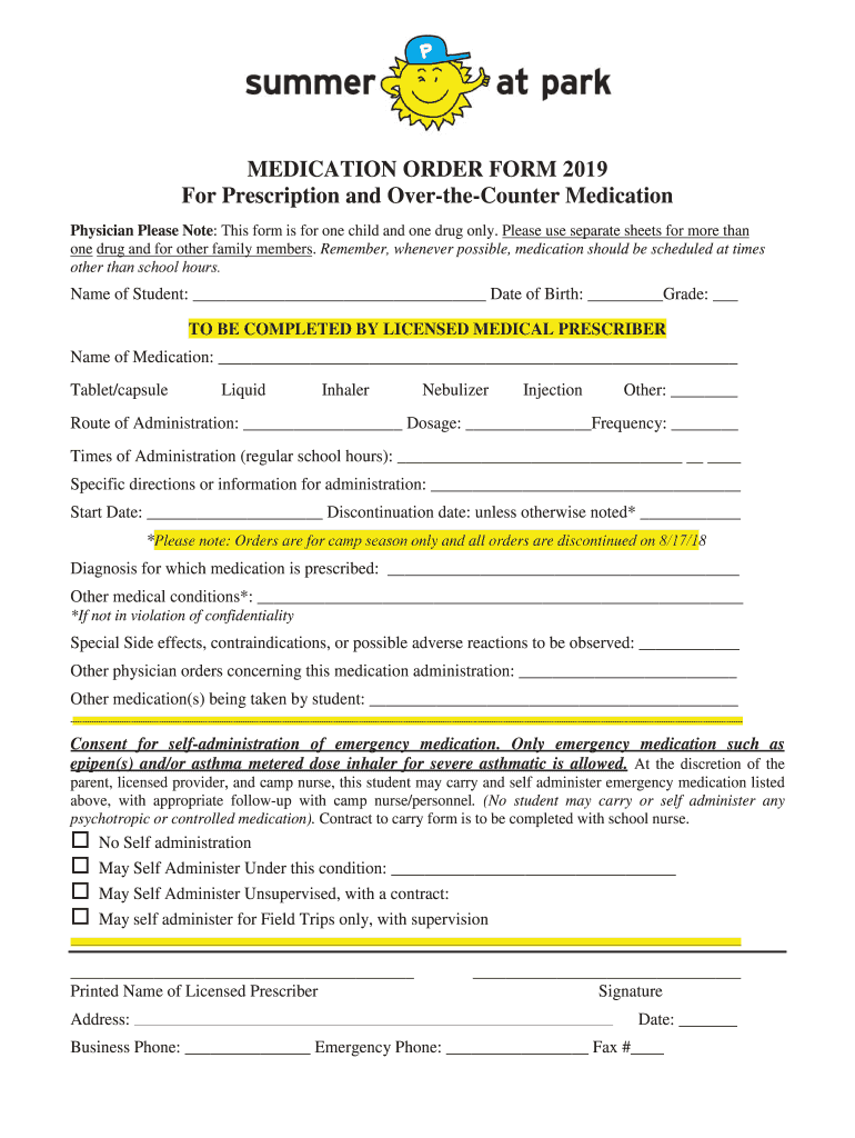 MEDICATION ORDER FORM 2019 For Prescription and OvertheCounter Medication Physician Please Note: This form is for one child and one drug only. Please use separate sheets for more than one drug and