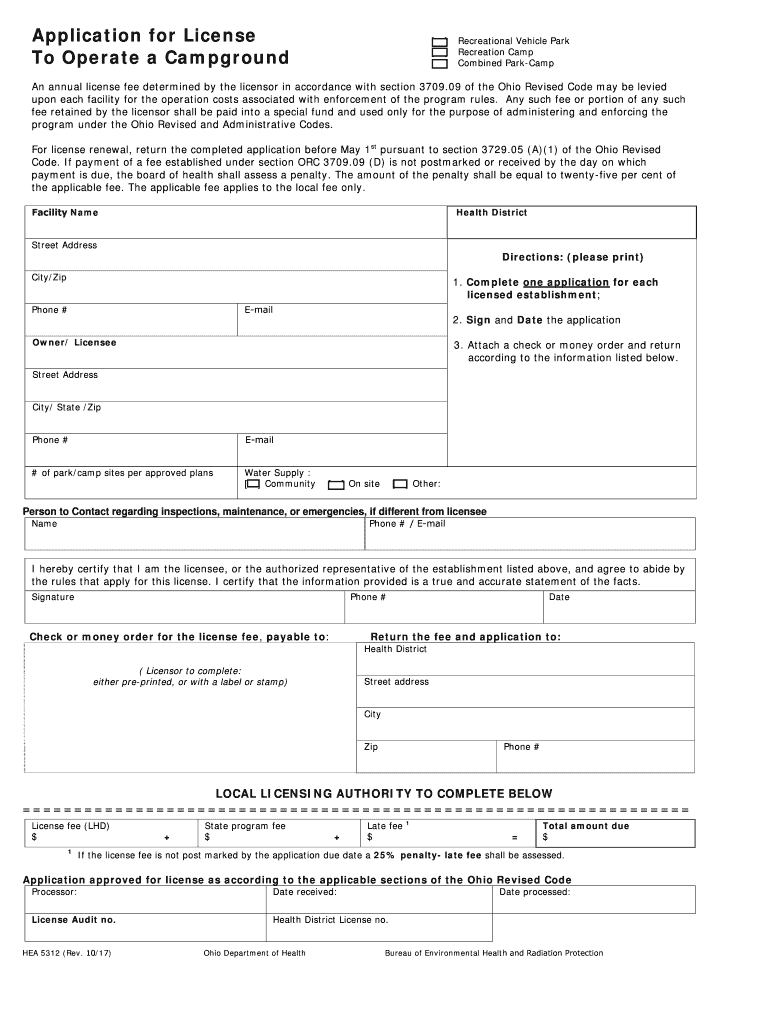 Application for License To Operate a Campground Recreational Vehicle Park Recreation Camp Combined Parkman annual license fee determined by the licensor in accordance with section 3709.09 of the Ohio