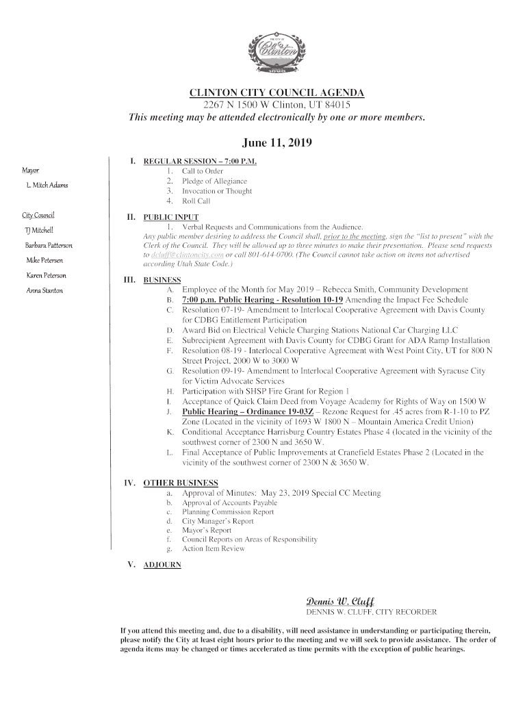 CLINTON CITY COUNCIL AGENDA 2267 N 1500 W Clinton, UT 84015 This meeting may be attended electronically by one or more members. June 11, 2019, Mayor. Mitch Audacity Council TJ Mitchell Barbara Patterson