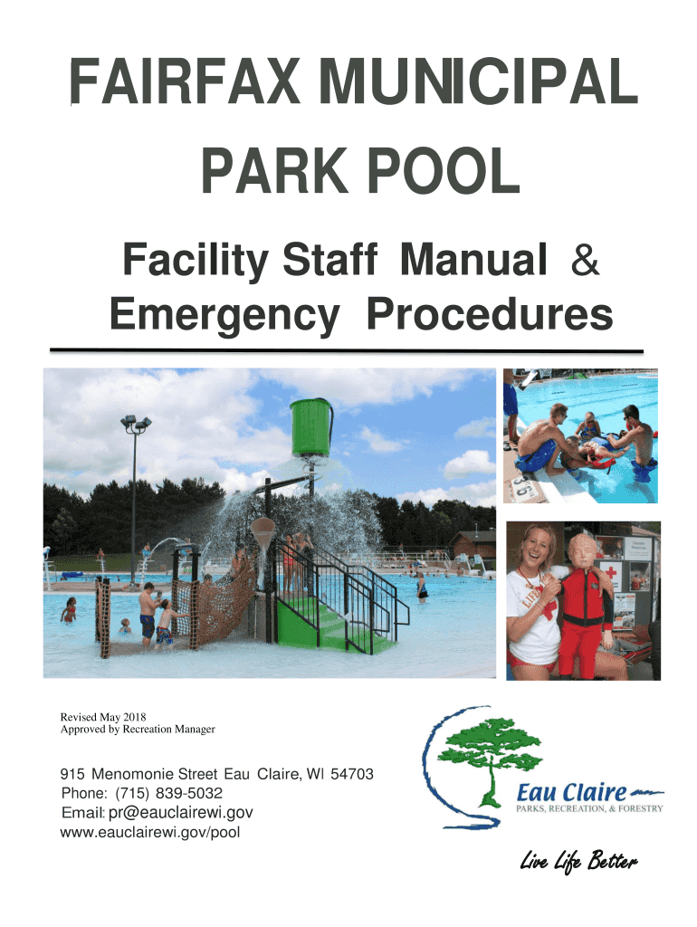 FAIRFAX MUNICIPAL PARK POOL Facility Staff Manual & Emergency ProceduresRevised May 2018 Approved by Recreation Manager915 Menominee Street Eau Claire, WI 54703 Phone: (715) 8395032 Email: pr Eau