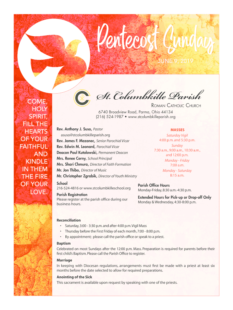 Pentecost Sunday, JUNE 9, 2019COME, HOLY SPIRIT, FILL THE HEARTS with YOUR FAITHFUL AND KINDLE IN THEM THE FIRE OF YOUR LOVE. St. Columbine Parish Roman Catholic ChuRCh6740 Broadview Road, Parma,
