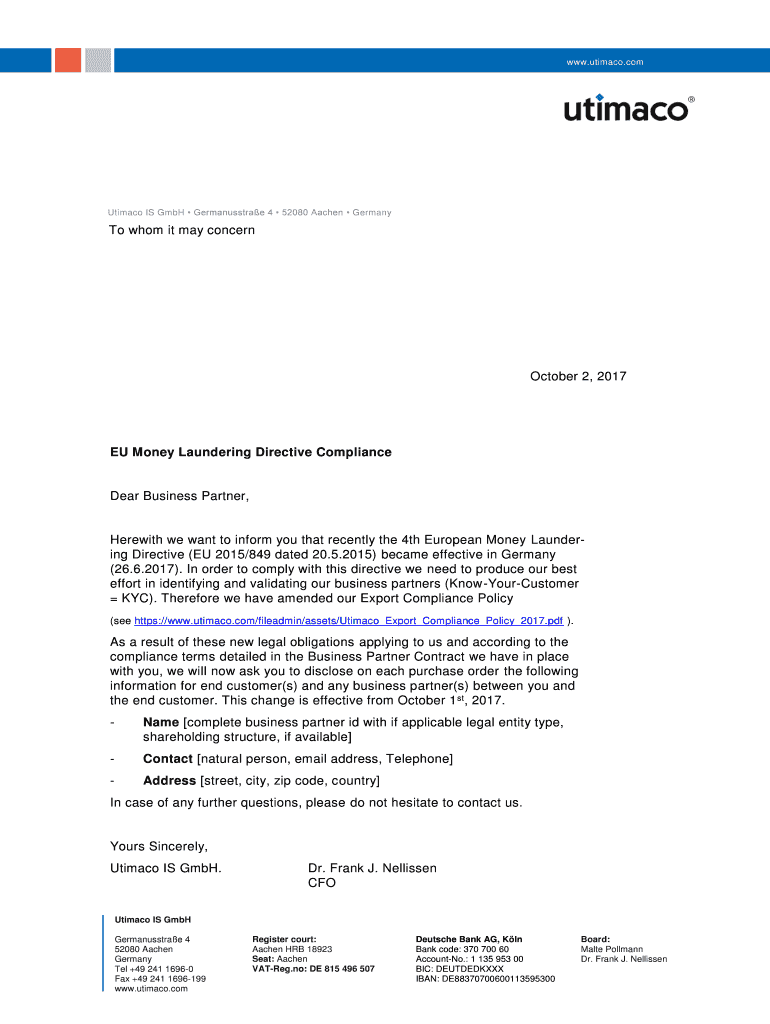 WWW.stomach.comUtimaco IS GmbH Germanusstrae 4 52080 Aachen Germany whom it may concern October 2, 2017EU Money Laundering Directive ComplianceDear Business Partner, Herewith we want to inform you