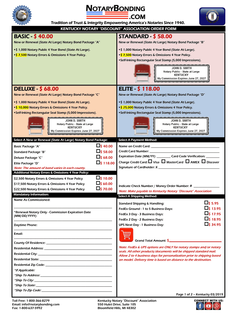 NOTARYBONDING .COM Tradition of Trust & Integrity Empowering Americas Notaries Since 1940. KENTUCKY NOTARY DISCOUNT ASSOCIATION ORDER FORM BASIC $40.00STANDARD $58.00New or Renewal (State At Large)