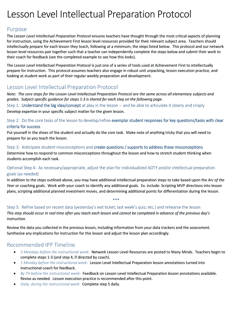 The Lesson Level Intellectual Preparation Protocol ensures teachers have thought through the most critical aspects of planning