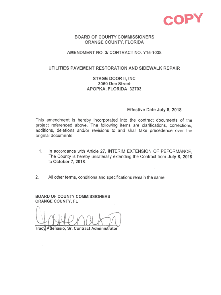 BOARD OF COUNTY COMMISSIONERS ORANGE COUNTY, FLORIDA AMENDMENT NO. 2/ CONTRACT NO. Y151 038UTILITIES PAVEMENT RESTORATION AND SIDEWALK REPAIR STAGE DOOR II, INC 3050 Dee Street APOPKA, FLORIDA 32703Effective