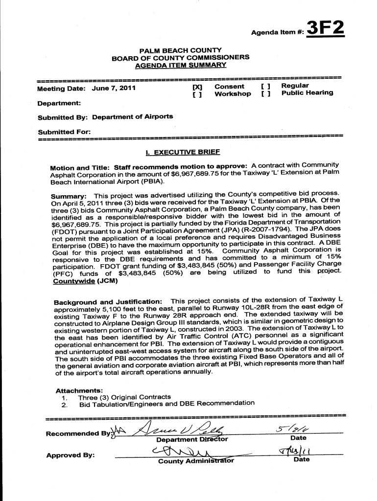 Agenda Item #:3F2PALM BEACH COIN TY BOARD OF COIN TY COMMISSIONERS AGENDA ITEM SUMMARY Regular X Consent June 7, 2011, Meeting Date: workshop Public HearingDepartment: Submitted By: Department of