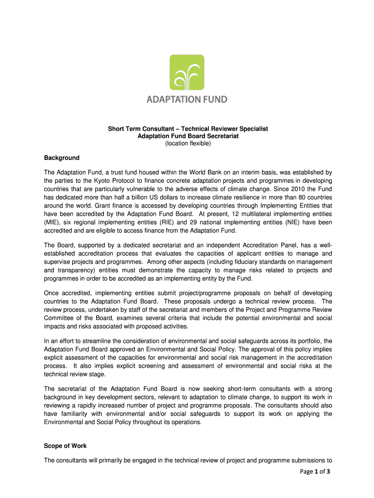 Short Term Consultant Technical Reviewer Specialist Adaptation Fund Board Secretariat (location flexible) Background The Adaptation Fund, a trust fund housed within the World Bank on an interim basis,