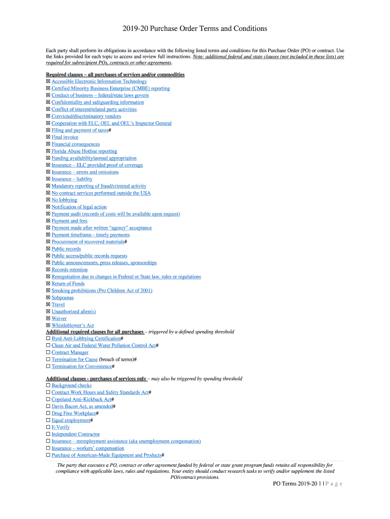 201920 Purchase Order Terms and Conditions Each party shall perform its obligations in accordance with the following listed terms and conditions for this Purchase Order (PO) or contract. Use the links