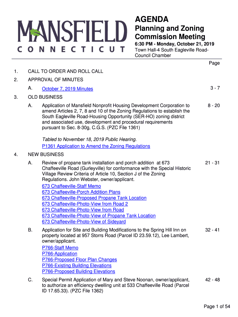 AGENDA Planning and Zoning Commission Meeting 6:30 PM Monday, October 21, 2019, Town Hall4 South Vaudeville RoadCouncil Chamber Page 1.CALL TO ORDER AND ROLL CALL2.APPROVAL OF MINUTES A.3. October
