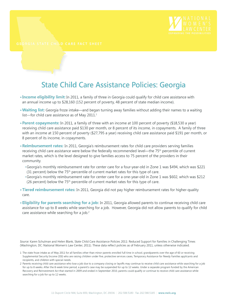 G E O R G I A S TAT E C H I L D C A R E FA C T S H ET State Child Care Assistance Policies: Georgia Income eligibility limit: In 2011, a family of three in Georgia could qualify for child care assistance