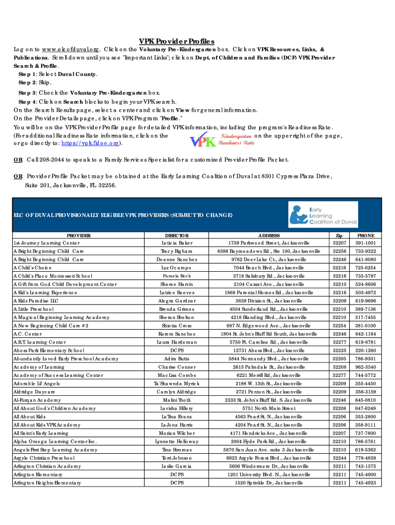 VP Provider Profiles on to www.elcofduval.org. Click on the Voluntary PreKindergarten box. Click on VP Resources, Links, & Publications. Scroll down until you see “Important Links “; click on