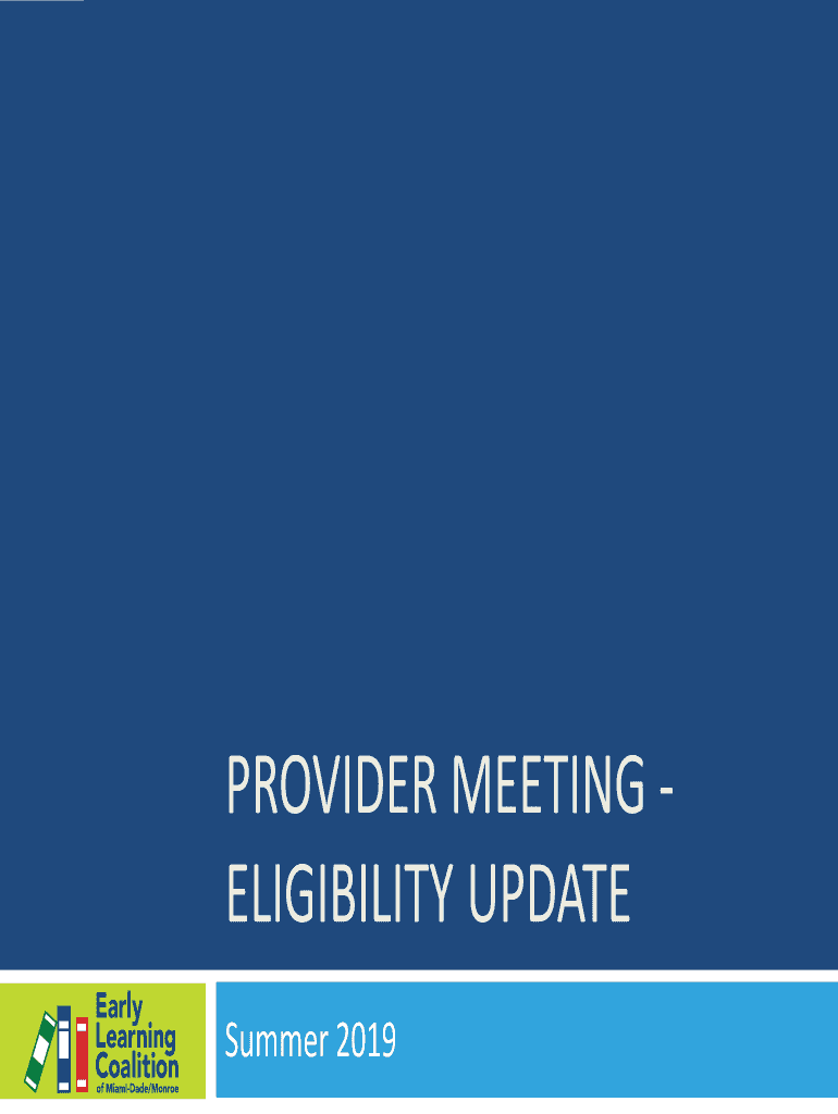 PROVIDER MEETING ELIGIBILITY UPDATE Summer 2019Pending Family Acceptance Negative impact: no acceptance no parent signature on certificate incomplete documentation on childSolution: Upon notice of