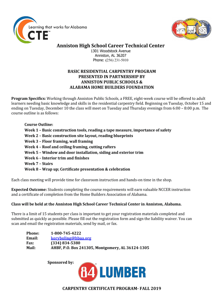 Anniston High School Career Technical Center 1301 Woodstock Avenue Anniston, AL 36207 Phone: (256) 2315010BASIC RESIDENTIAL CARPENTRY PROGRAM PRESENTED IN PARTNERSHIP BY ANNISTON PUBLIC SCHOOLS &