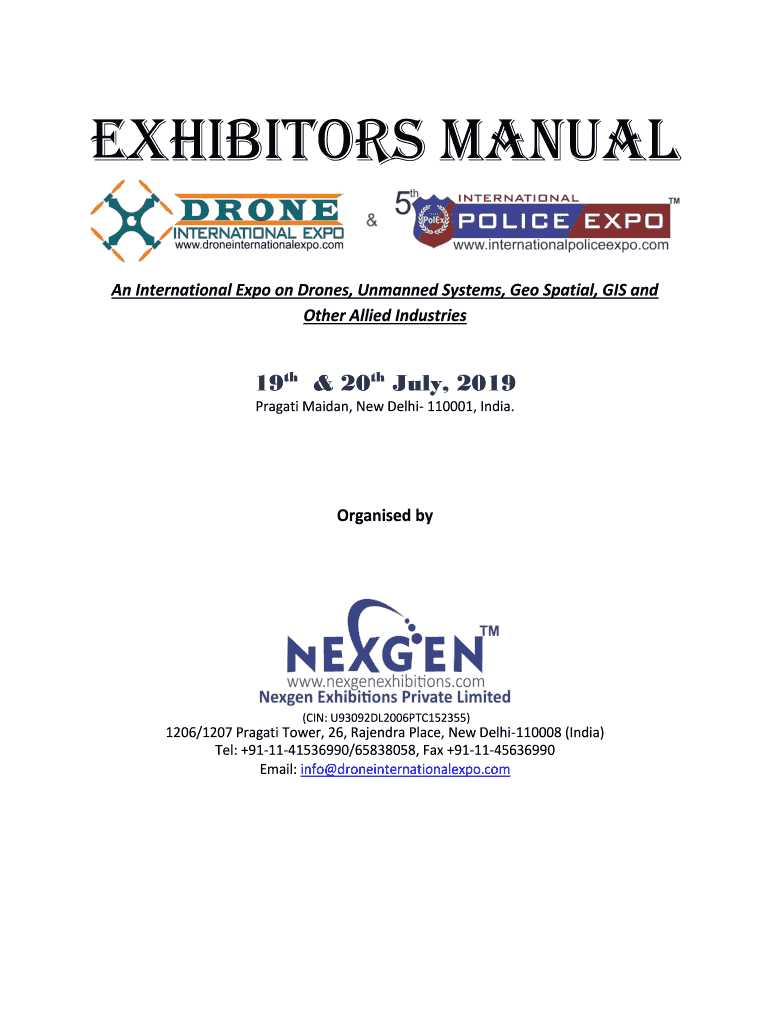 EXHIBITORS MANUAL An International Expo on Drones, Unmanned Systems, Geo Spatial, GIS and Other Allied Industries19th & 20th July 2019 Pragmatic Maidan, New Delhi 110001, India. Organized by(IN: U93092DL2006PTC152355)1206/1207