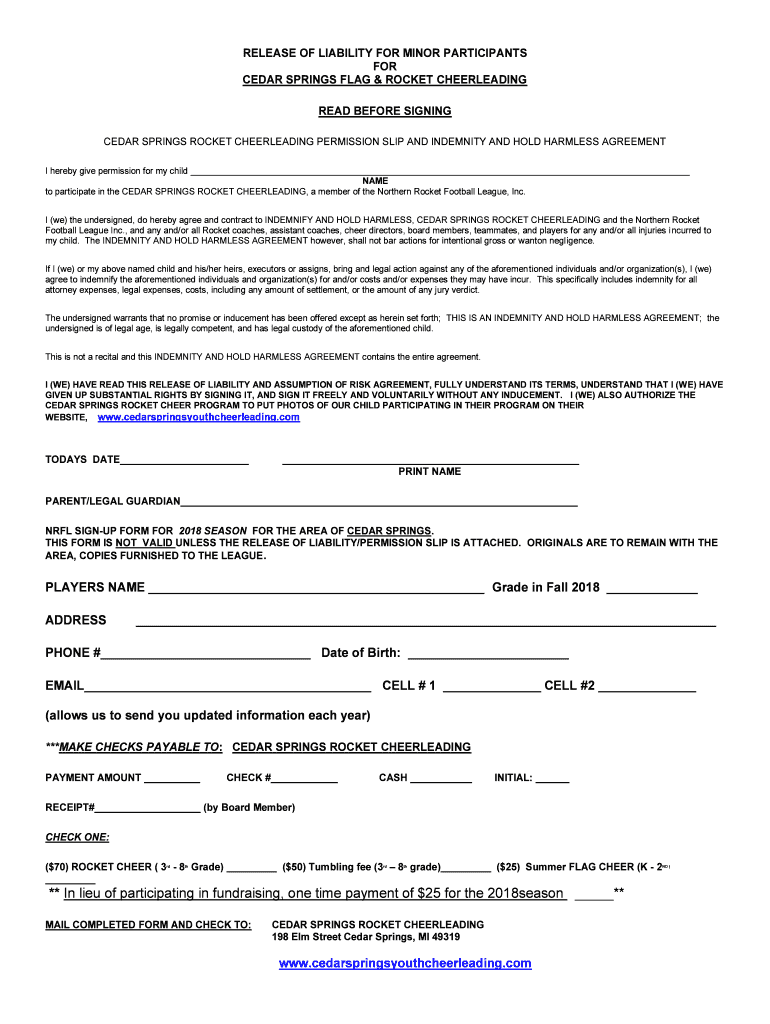 CEDAR SPRINGS ROCKET CHEERLEADING PERMISSION SLIP AND INDEMNITY AND HOLD HARMLESS AGREEMENT