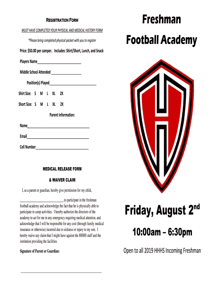 Registration Form MUST HAVE COMPLETED YOUR PHYSICAL AND MEDICAL HISTORY FORM *Please bring completed physical packet with you to registerFreshman Football Academy Price: $50.00 per camper. Includes:
