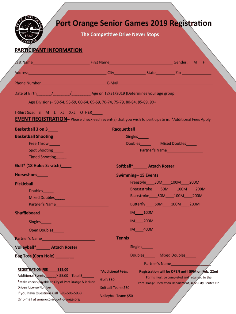 Port Orange Senior Games 2019 Registration The Competitive Drive Never StopsPARTICIPANT INFORMATION Last Name First Name Gender:Address City State Zip Phone Number Email Date of Birth / / Age on 12/31/2019