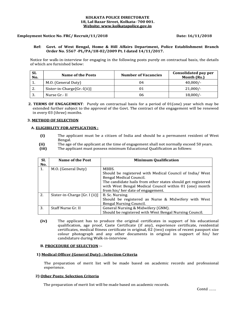 KOLKATA POLICE DIRECTORATE 18, Law Bazaar Street, Kolkata 700 001. Website: www.kolkatapolice.gov.in Employment Notice No. FRC/ Recruit/11/2018 Ref:Date: 16/11/2018Govt. Of West Bengal, Home & Hill