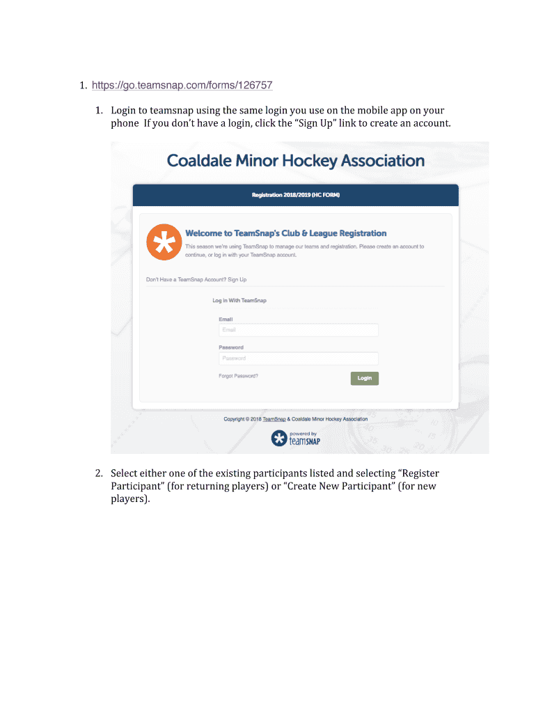 1.https://go.teamsnap.com/forms/1267571. Login×to team snap×using×the×same×login×you×use×on the×mobile×app×on yourphoneIf×you don't have×a login, ×click×the×Sign×Up link×to create×an account.2.