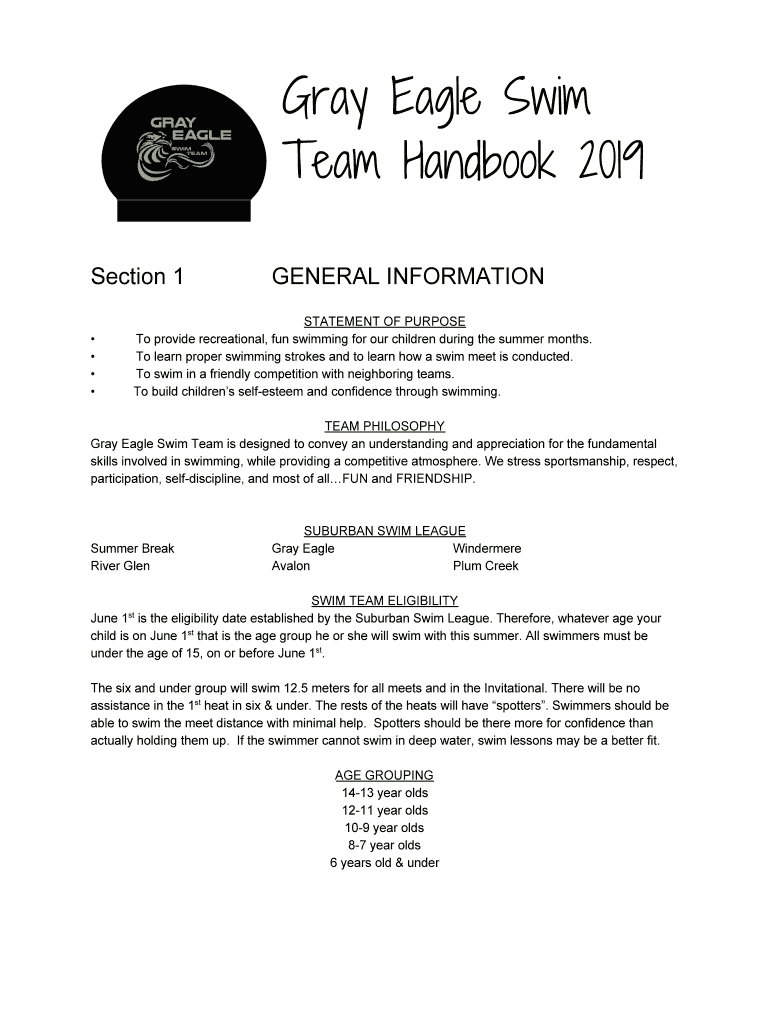 Gray Eagle Swim Team Handbook 2019 Section 1 GENERAL INFORMATIONSTATEMENT OF PURPOSE To provide recreational, fun swimming for our children during the summer months. To learn proper swimming strokes