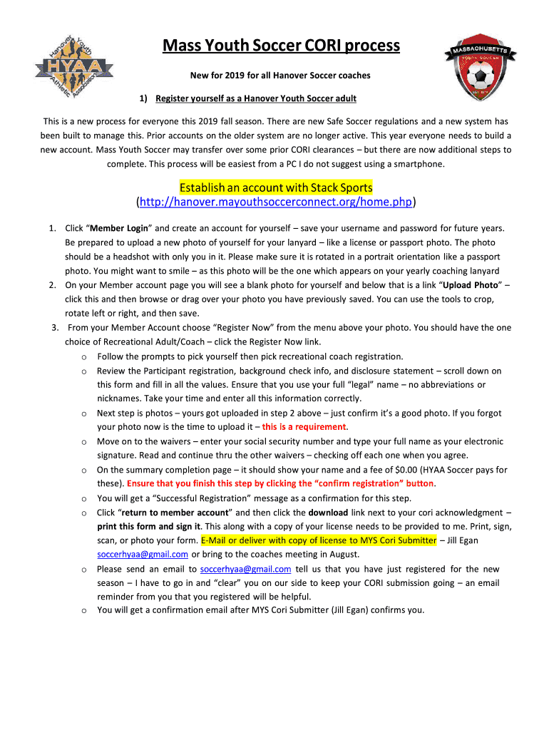 Mass Youth Soccer CORI process New for 2019 for all Hanover Soccer coaches 1) Register yourself as a Hanover Youth Soccer adult This is a new process for everyone this 2019 fall season. There are